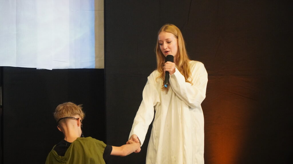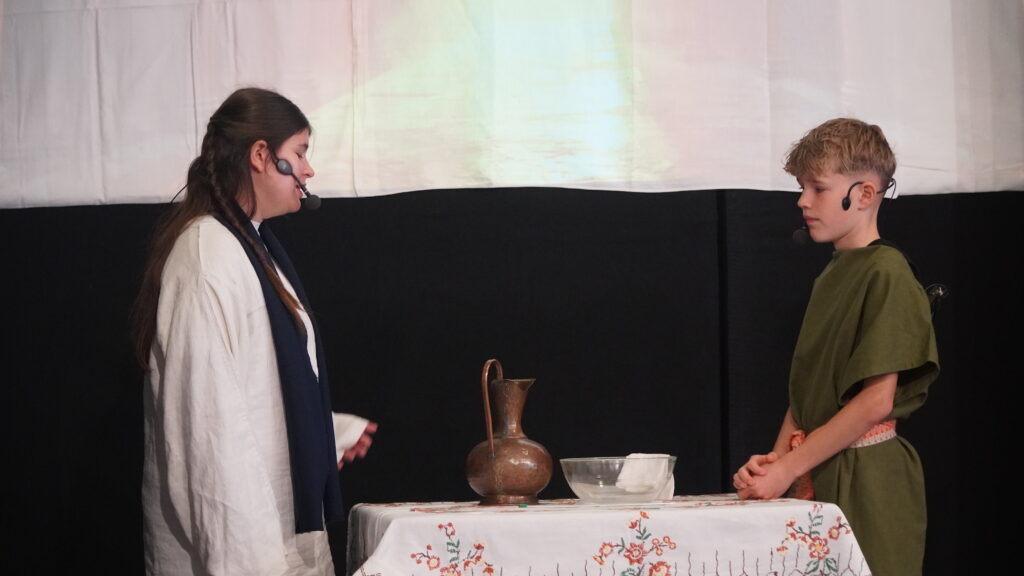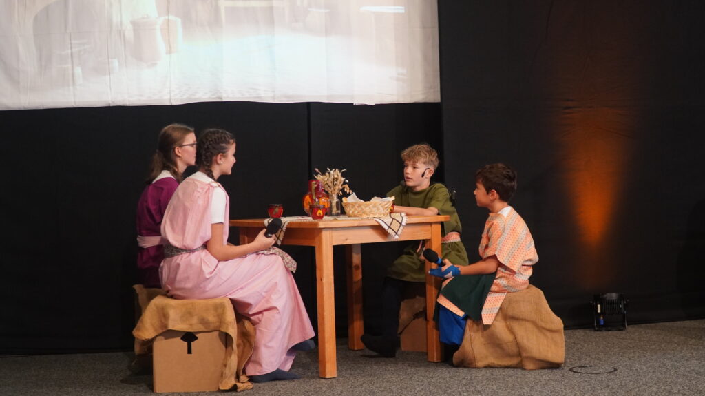 Neben den Chormitgliedern waren Ehemalige, Angehörige und Besucher der Landeskirchlichen Gemeinschaft gekommen. Was uns besonders freute: Es ließen sich auch Leute einladen, zu denen wir sonst wenig Kontakt haben. Der Saal war voll, und auch im Untergeschoss verfolgten viele die Übertragung. Schon am Vorabend führten die Kinder das Musical ein erstes Mal auf – sonst hätte der Platz erst recht nicht gereicht.