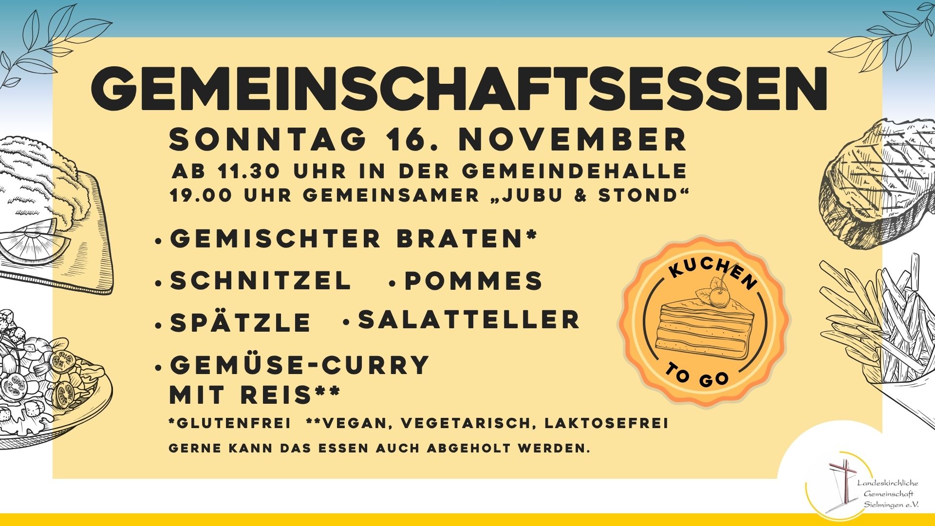Wir laden euch herzlich ein zum diesjährigen Gemeinschaftsessen in der Gemeindehalle! Lasst euch verwöhnen und genießt ein leckeres Essen. Der Erlös kommt wie immer der Finanzierung der Betriebskosten des Vereinshauses zugute.