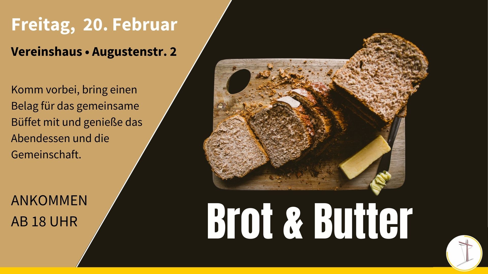 Der Tisch ist gedeckt, Brot und Butter stehen bereit. Komm vorbei, bring einen Belag für das gemeinsame Büfett mit und genieße das Abendessen und die Gemeinschaft.